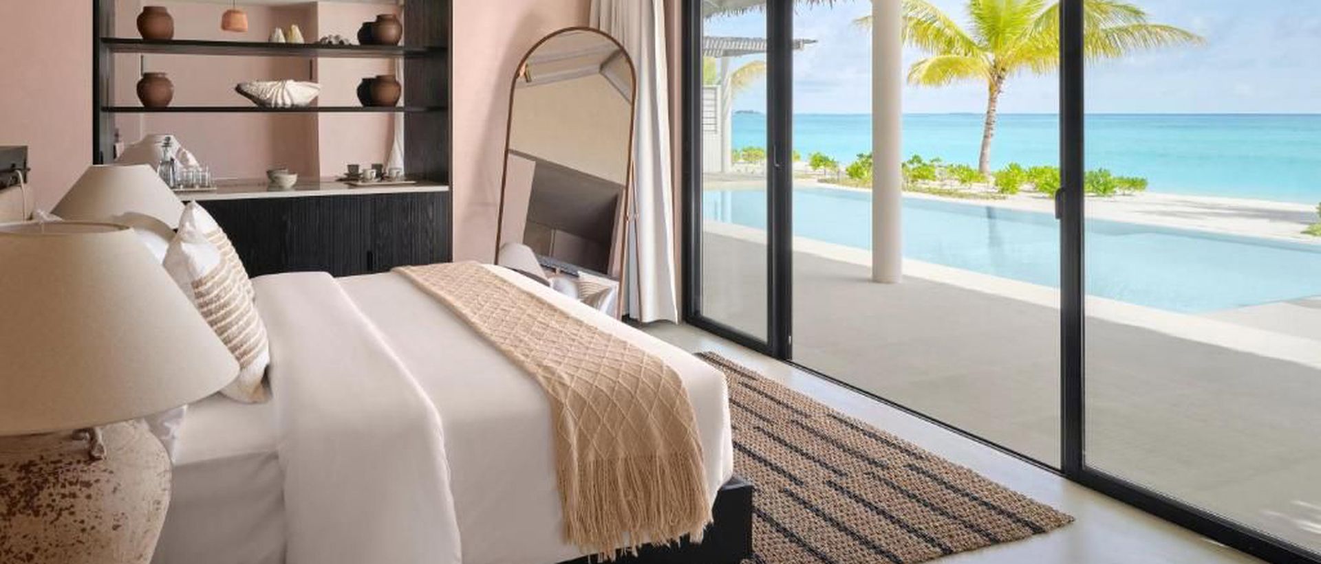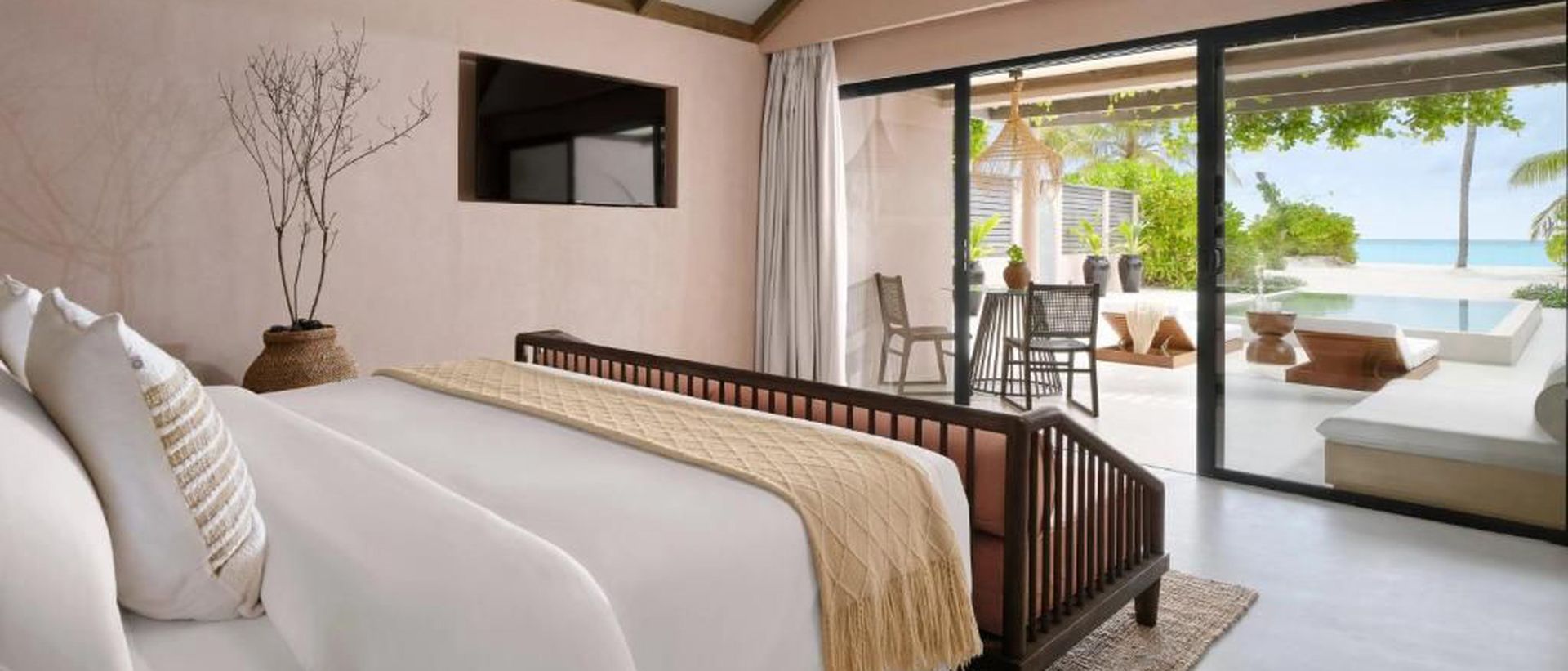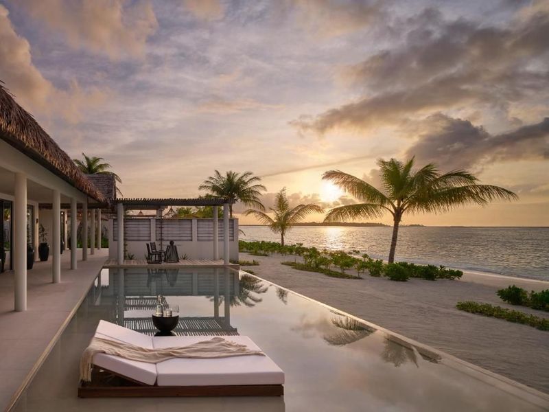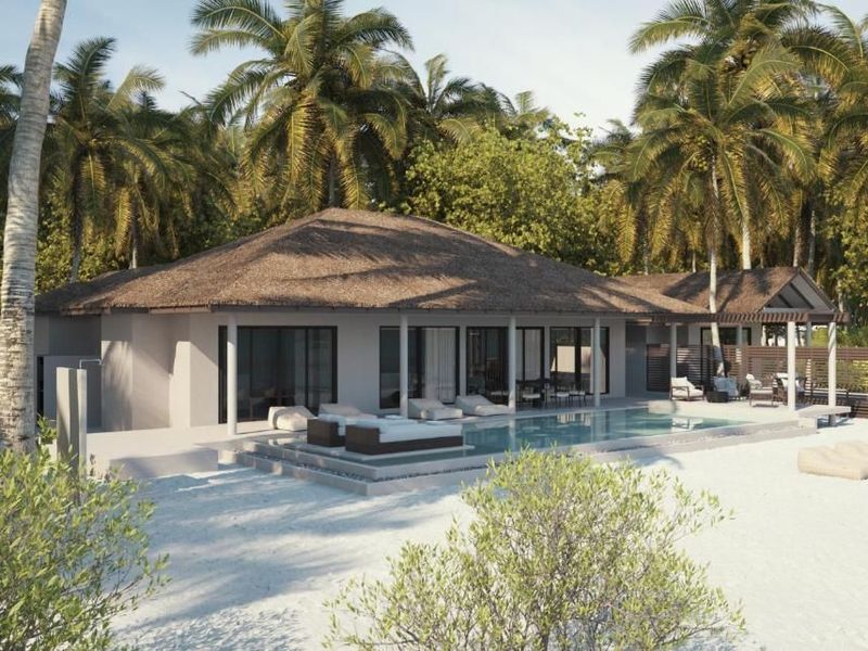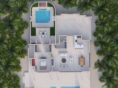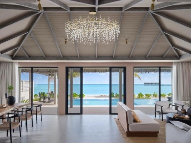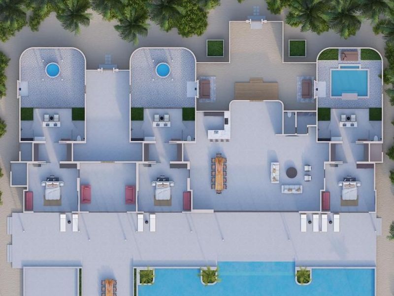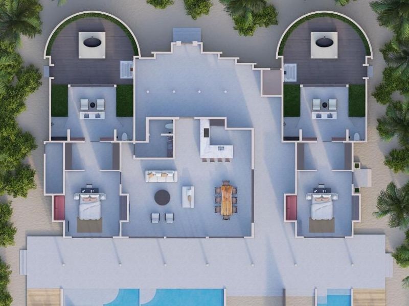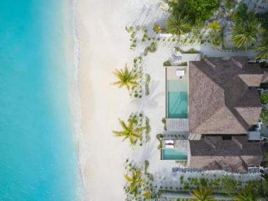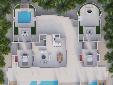 6 Two Bedroom Residence with Two Beach Pools and Garden Pool (~1426 кв.м) – двуспальные береговые резиденции с тремя бассейнами. Состоят из двух спален, двух ванных комнат с отдельной ванной и душем на открытом воздухе, бассейна во внутреннем дворе, гостиной с обеденной зоной, просторной террасы с двумя бассейнами, лежаками и зоной для дневного отдыха. Максимальное размещение - 6 взрослых или 2 взрослых и 4 ребенка.