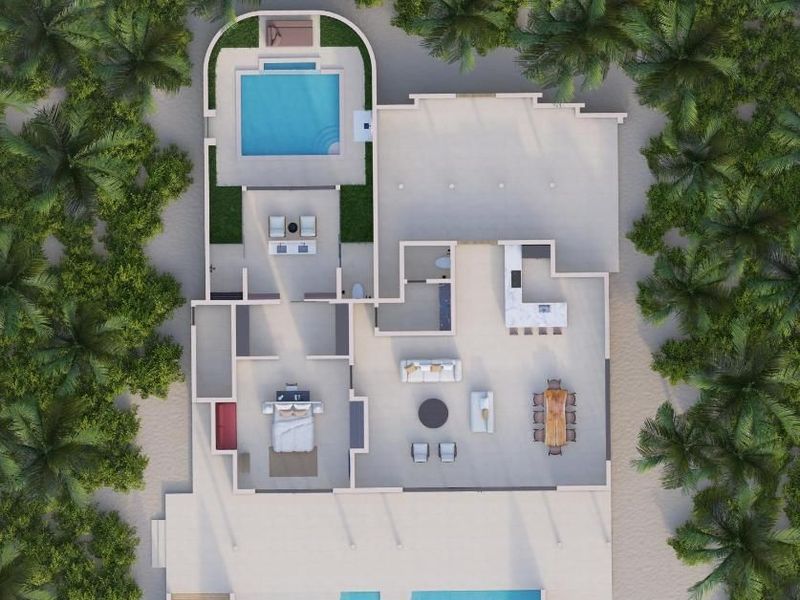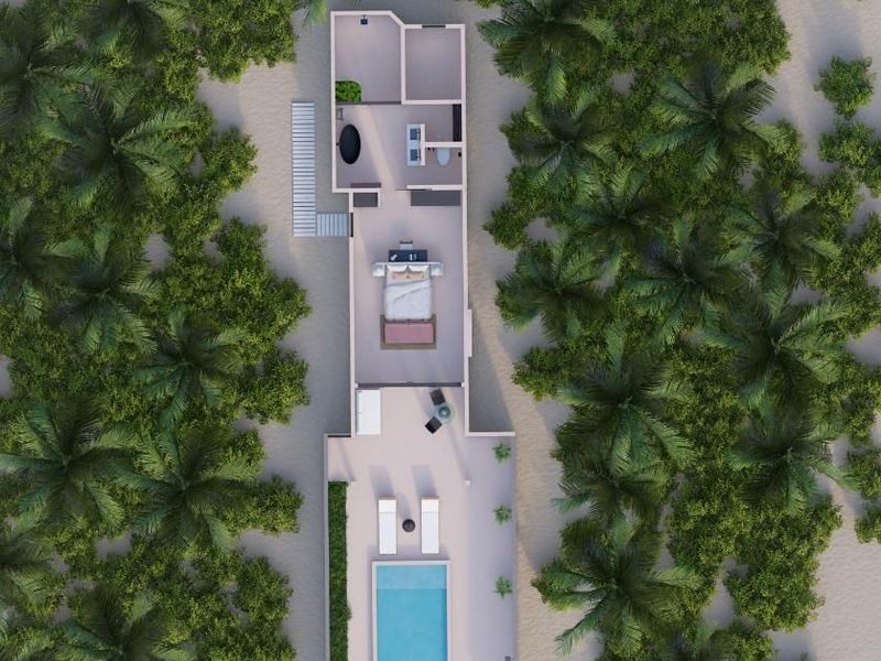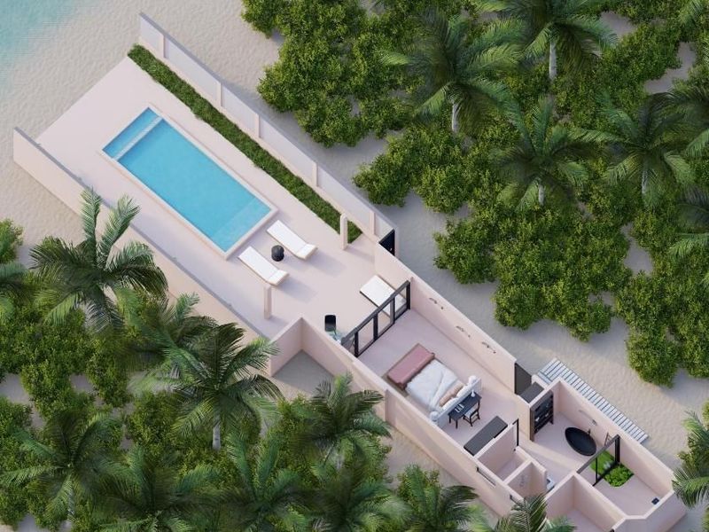 7 Two Bedroom Residence with Two Beach Pools (~1426 кв.м) – двуспальные береговые резиденции с двумя бассейнами. Состоят из двух спален, двух ванных комнат с отдельной ванной и душем на открытом воздухе, гостиной с обеденной зоной, просторной террасы с бассейнами. Один из них, окруженный природой, остается скрытым, предлагая уединение и интимность, в то время как другой находится всего в двух шагах от пляжа. Максимальное размещение - 6 взрослых или 2 взрослых и 4 ребенка.